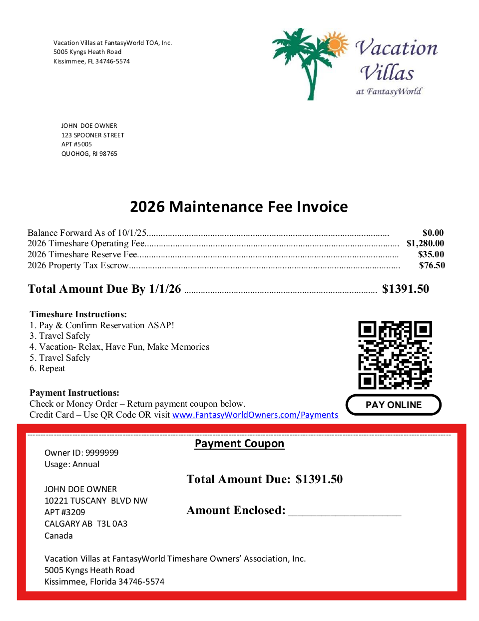 Checks should be made payable to: Vacation Villas at FantasyWorld TOA, Inc.